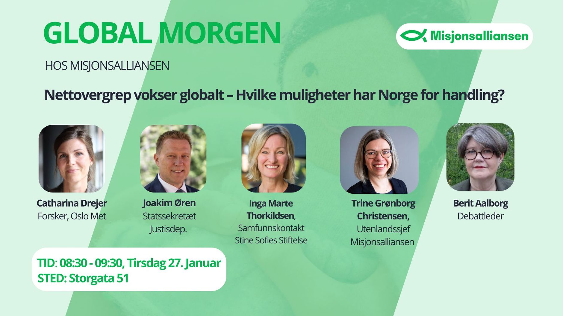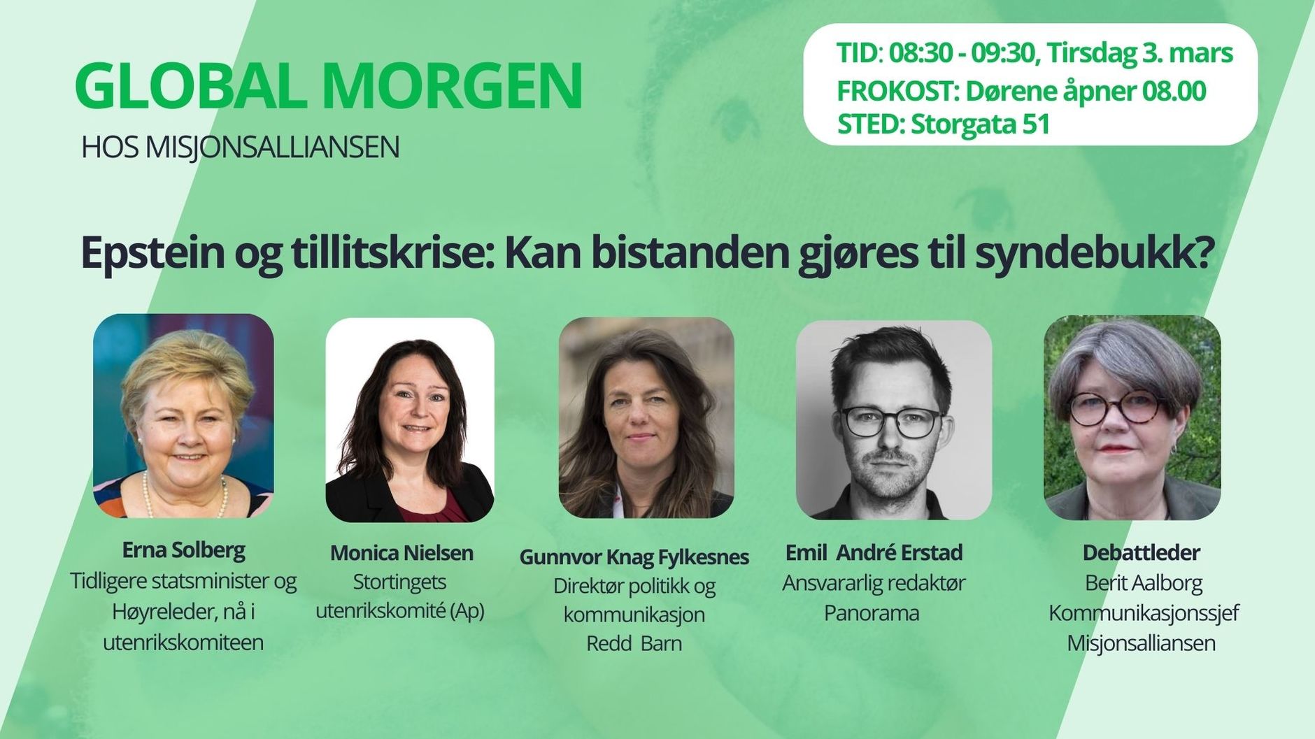 08.30-09.10: Politikerne Erna Solberg (H) og Monica Nielsen (Ap), begge i Stortingets utenrikskomité vil reflektere rundt hvilke konsekvenser Epstein-saken kan få for bistandsfeltet.